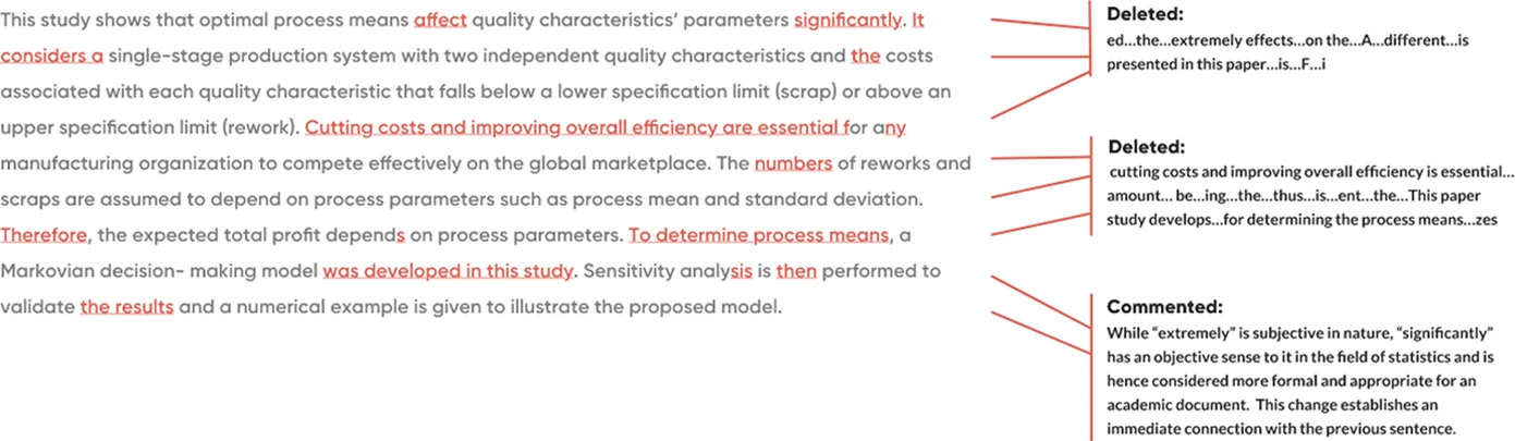 Our research paper editing services use globally acknowledged plagiarism checkers, which find potential content that might be detected as unintentional plagiarism, this helps in avoiding desk rejection. We will highlight the areas of your paper that require revision and will inform you through a report. Our journal editing services also provide you with expert comments on how these sections may impact the journal's review.